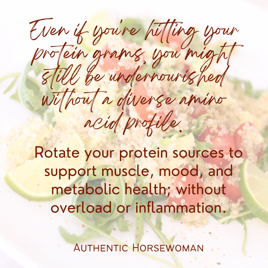 Many women eat the same protein sources daily; eggs for breakfast, salad with chicken, maybe even more chicken for dinner, which can lead to imbalances over time. And as we age, our digestion becomes less efficient at breaking down and absorbing amino acids. That’s why we need to be more intentional about quality and variety.